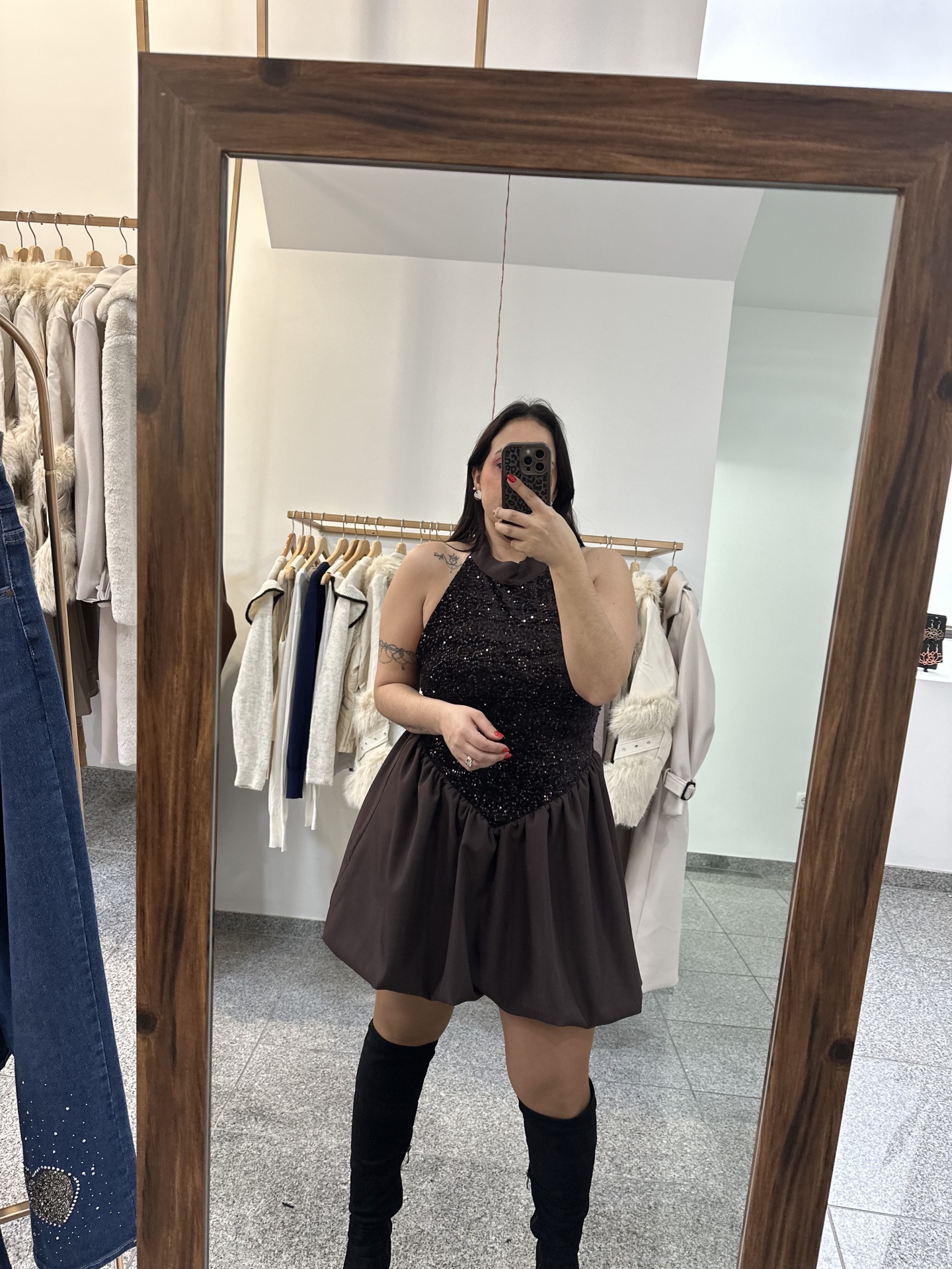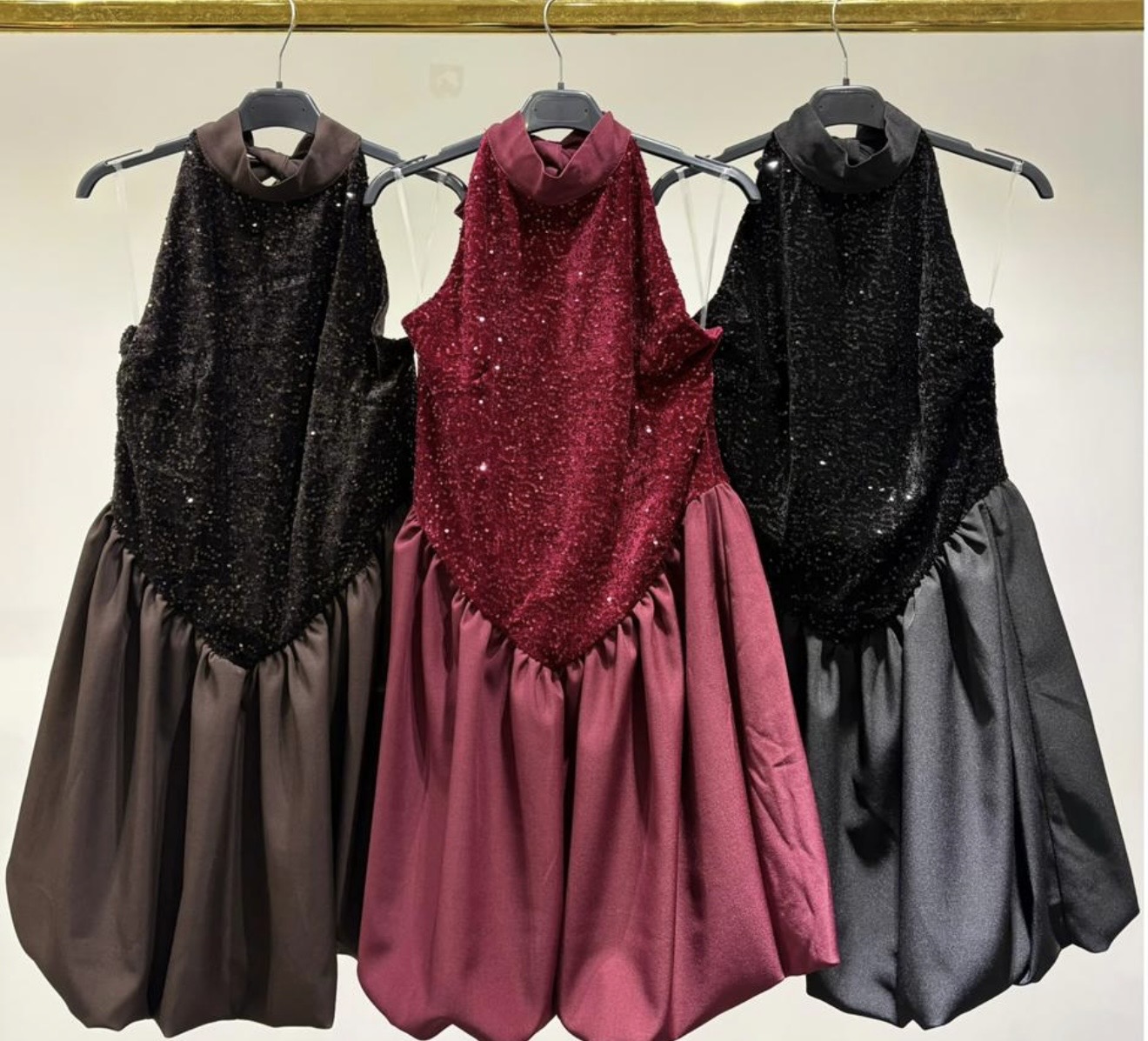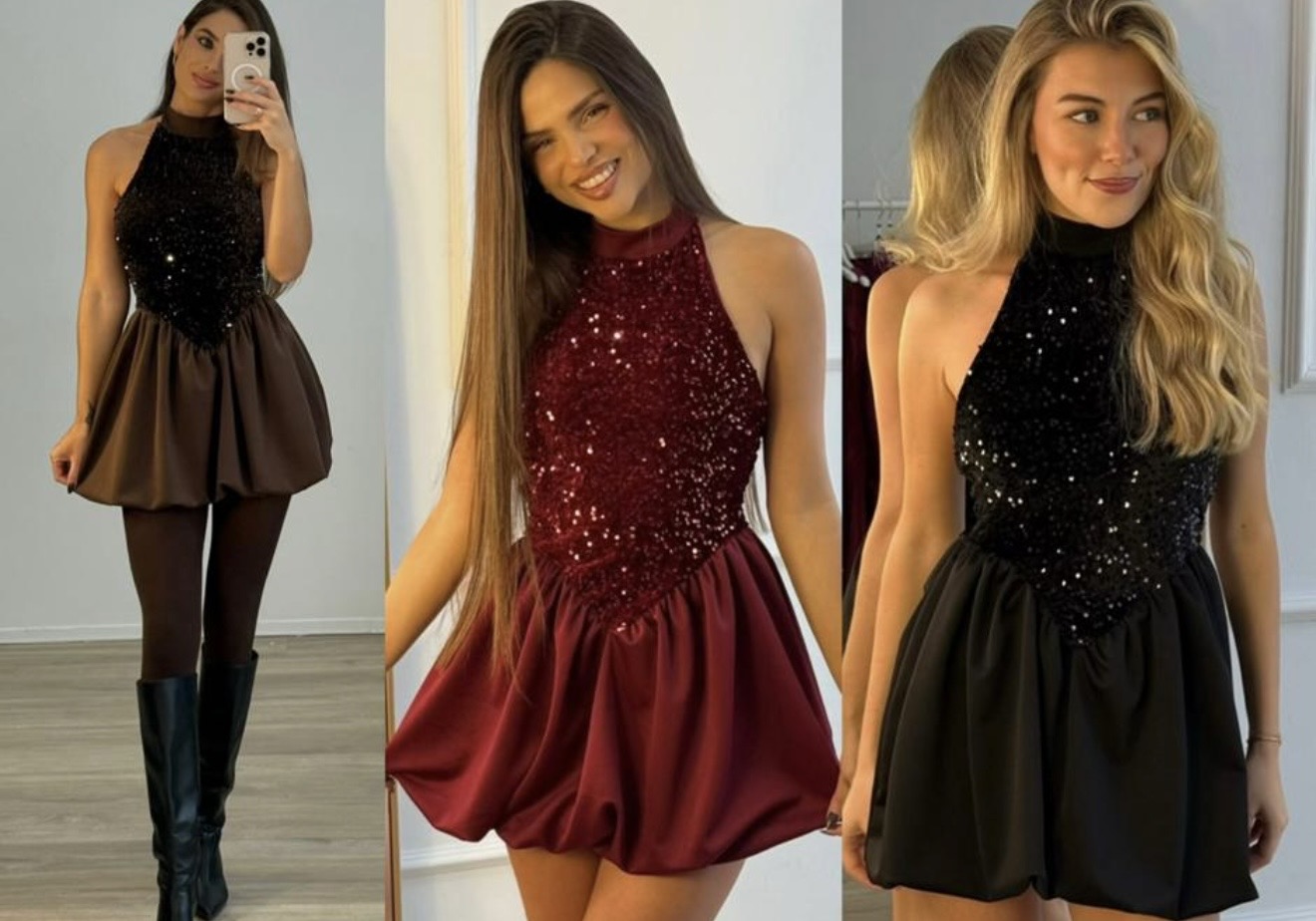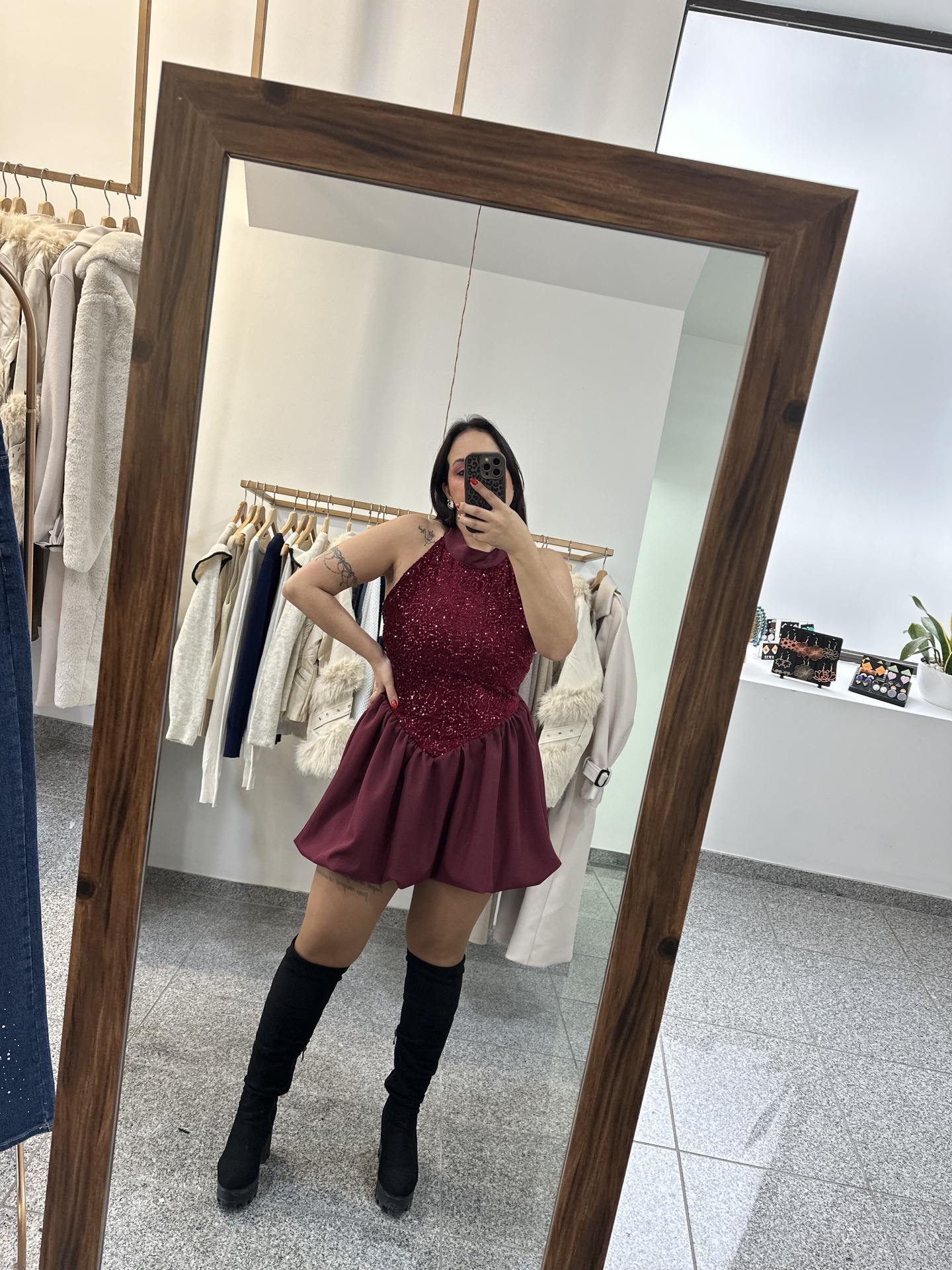 Mulher apresenta vestidos curtos brilhantes preto e vermelho em loja com plantas e espelho Vestido Vanila 18,00 € Desconto de %. Partilhar Cor Preto Tamanho TU Comprar Contactar Veste até L Marca Trevo Store